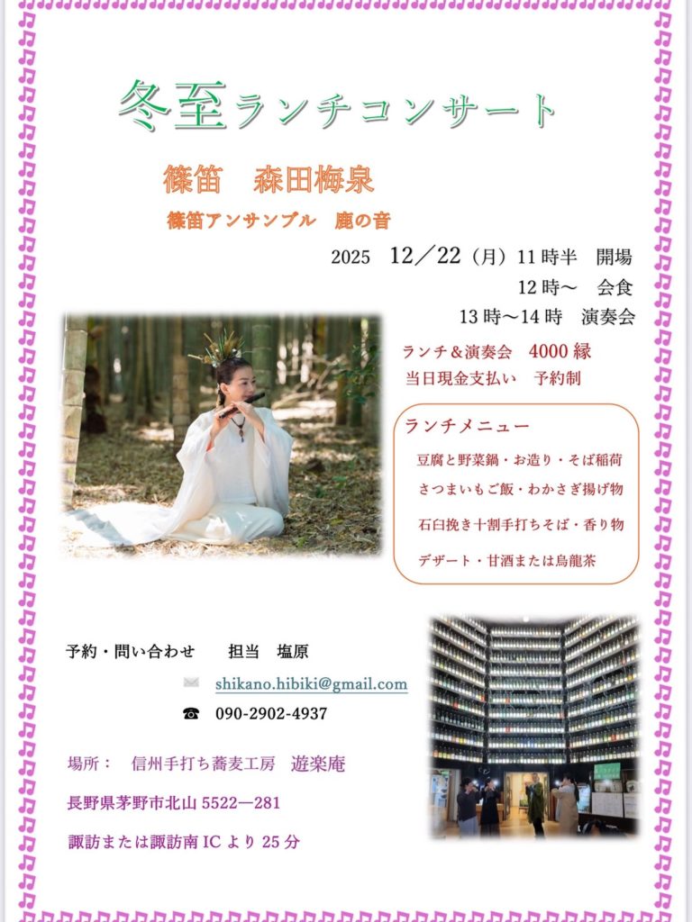 2025年12月22日 冬至ランチコンサート 2025.11.21 冬至ランチコンサート 日程 12月22日(月)時間 11時半開場/12時会食/13時〜14時演奏会会場 遊楽庵(蓼科高原)料金 4.000円予約 090-2902-4937 shikano.hibiki@gmail.com Tweet Share Pin it この記事のタイトルとURLをコピーする 2025年11月13日(木)瀬戸龍介ソロ・ライブ 前の記事 2026年2月8日(日)~HEAVEN~BAISENコンサート in Classica 次の記事
